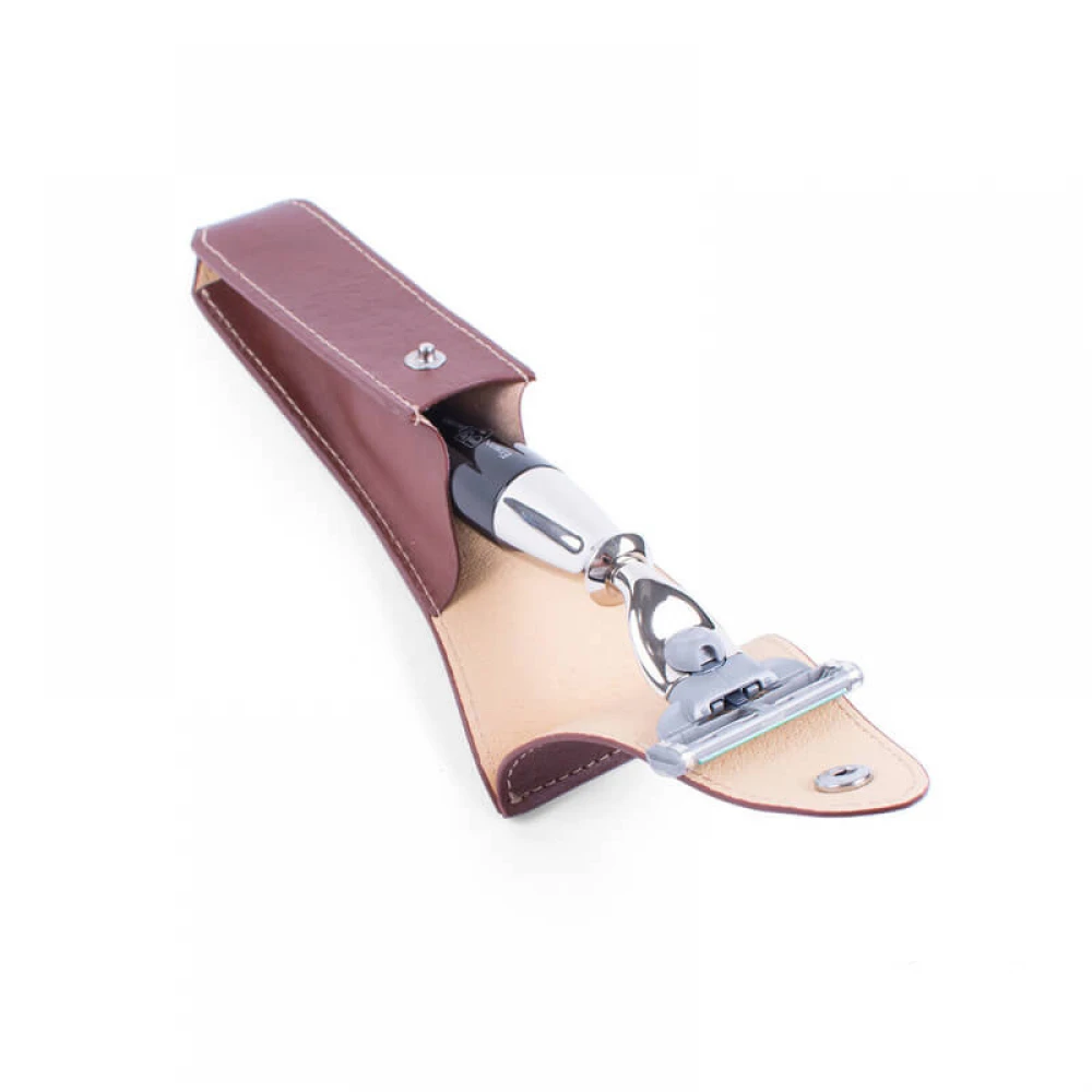 Вишуканий чохол ручної роботи. Натуральна благородна шкіра забезпечує високу якість виробу. Зручний чохол для зберігання Вашої улюбленої бритви. Ідеально підходить для бритви Edwin Jagger Fusion або Mach 3.