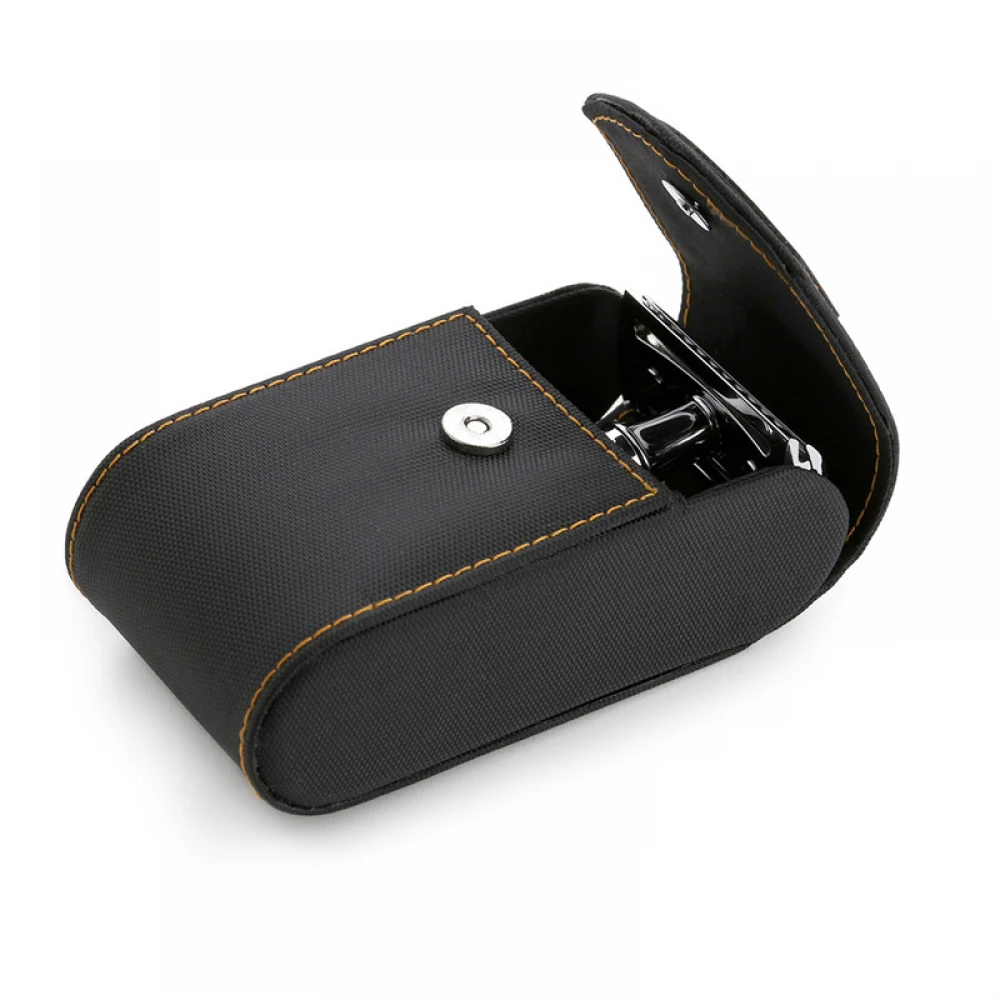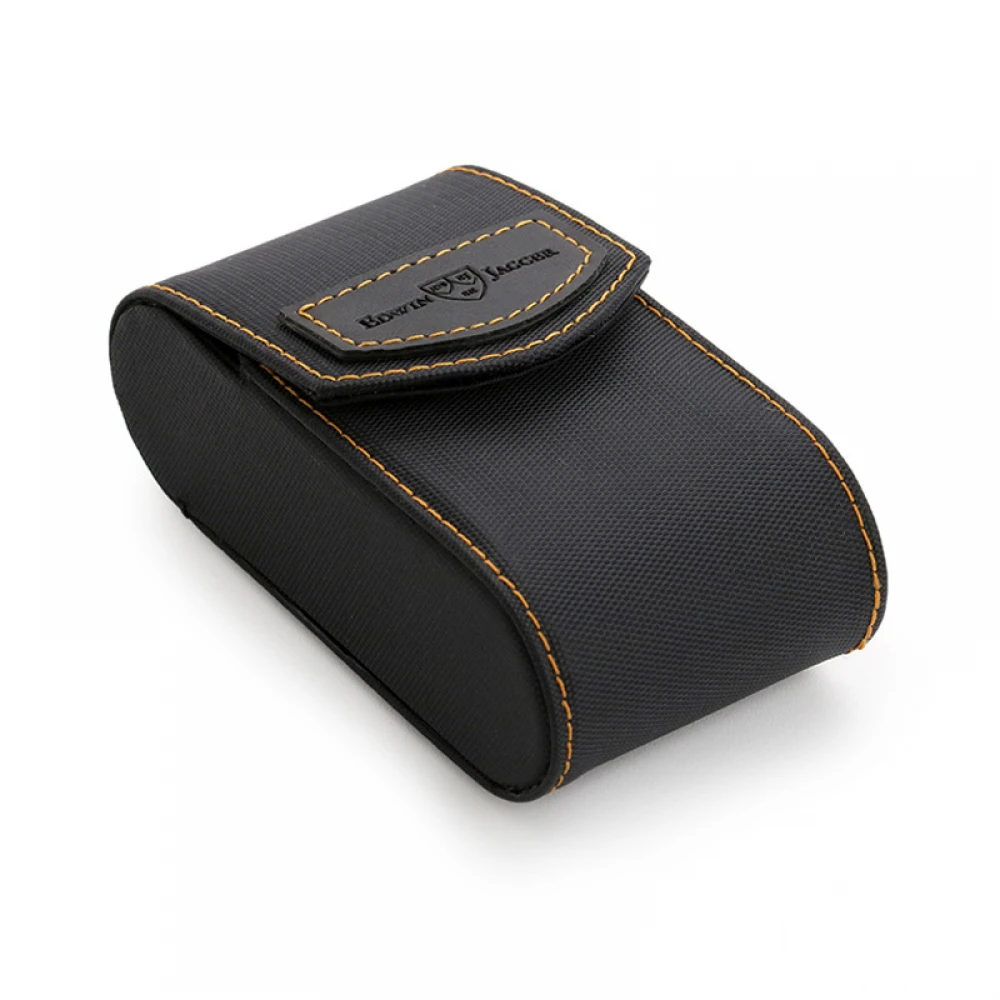 Чохол для традиційних бритв Edwin Jagger з чорної тканини з обробкою з апельсинової нитки. Закривається на магнітну застібку. Всередині є додаткові відділення для двох бритв. Зручний, елегантний кейс знадобиться для захисту бритви, наприклад, у подорожі.