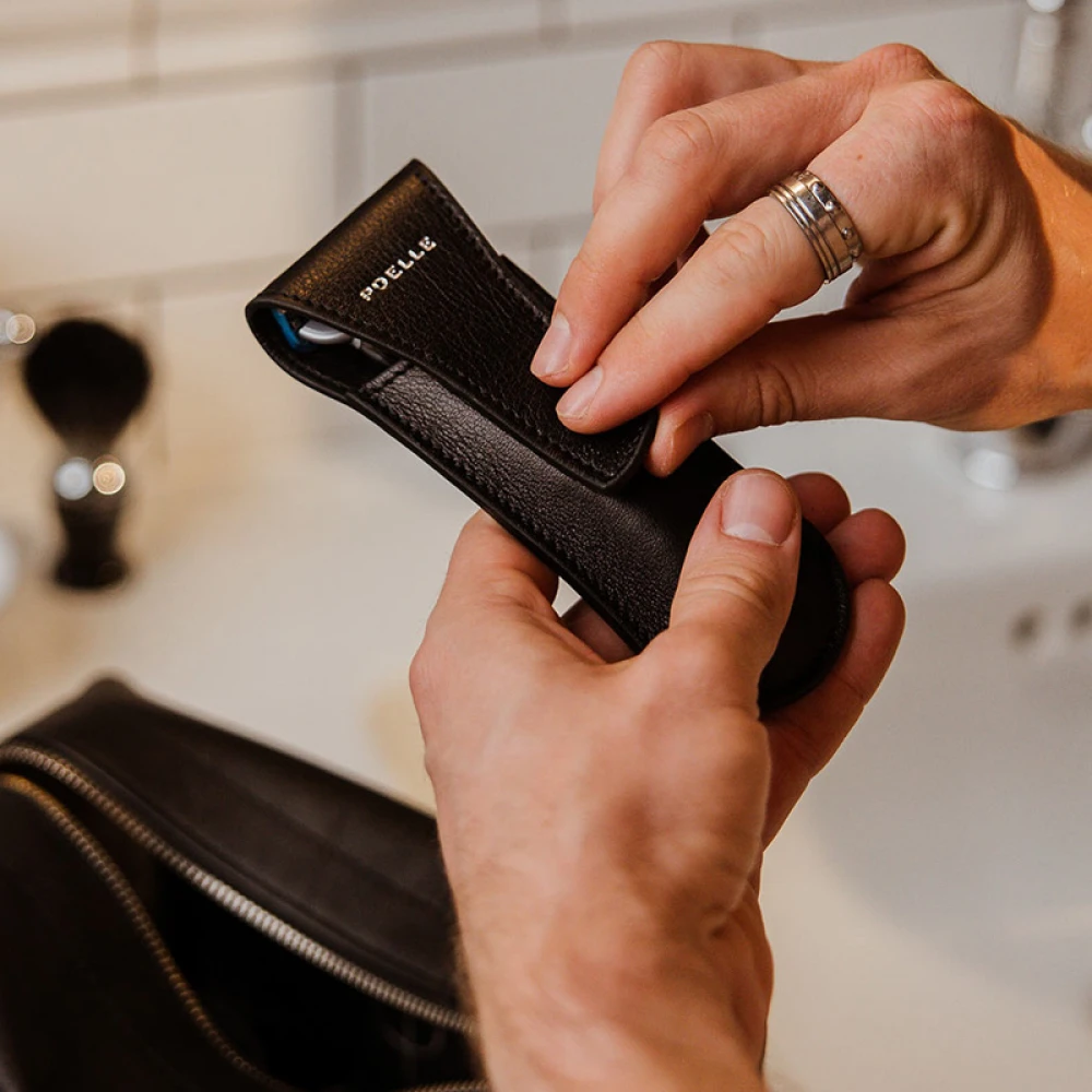 Чохол для станка шкіряний Poelle (чорний) - унікальний аксесуар, який необхідний кожному чоловіку! Виготовлений з натуральної шкіри, закривається на липучці. Має універсальний розмір, тому підходить для будь-якої моделі станка.
