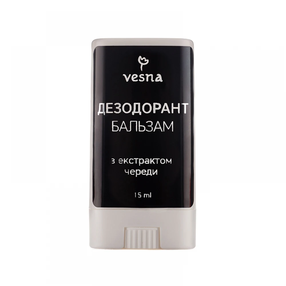 Натуральний дезодорант Vesna Deodorant-Balm з екстрактом череди підходить як для жінок, так і для чоловіків. Активно захищає від запаху поту протягом дня, зменшує потовиділення, не блокуючи потові залози. Не містить алюмінію, триклозану, парабенів, тальку.