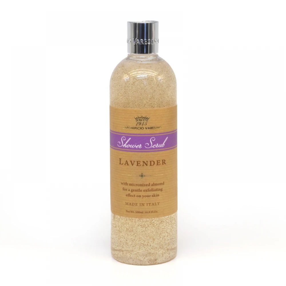 Ароматний гель для душу Saponificio Varesino Shower Scrub Lavender у форматі 500 мл з мікронізованою шкаралупою мигдалю для делікатного відлущуючого ефекту.