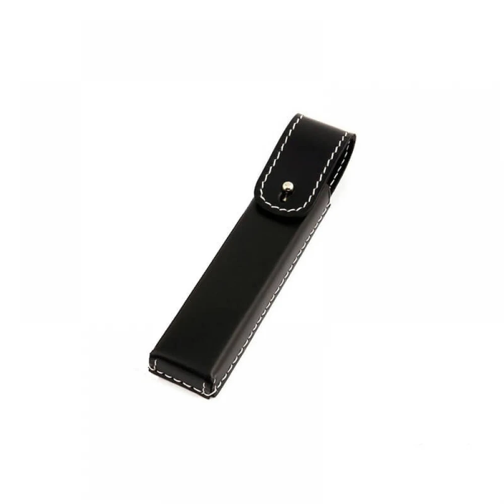 Класичний футляр для однієї бритви, виконаний зі щільної натуральної чорної шкіри з білим прошиттям. Всередині оксамитова підкладка. Застібка виготовлена зі срібла.