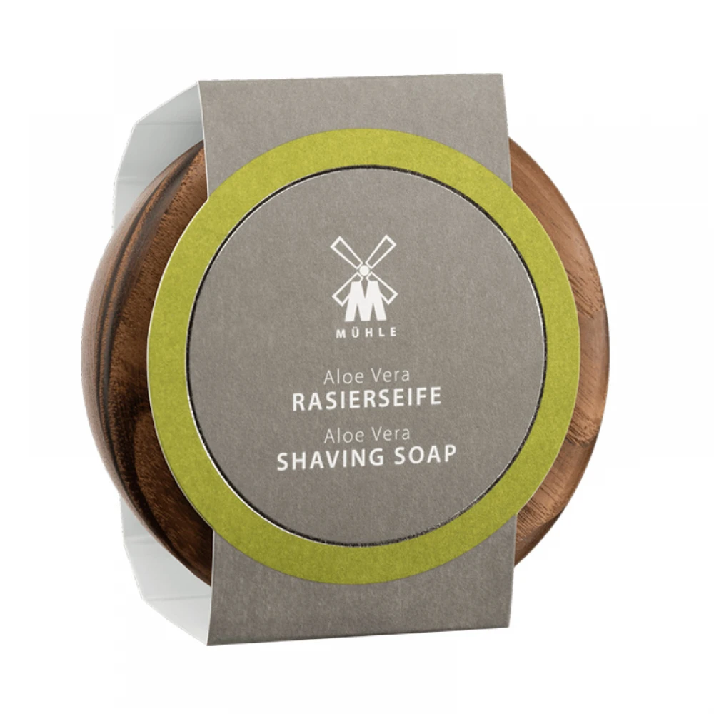 Мило для гоління Muhle Aloe Vera Shaving Soap в декоративній дерев'яній чаші з термоясена.