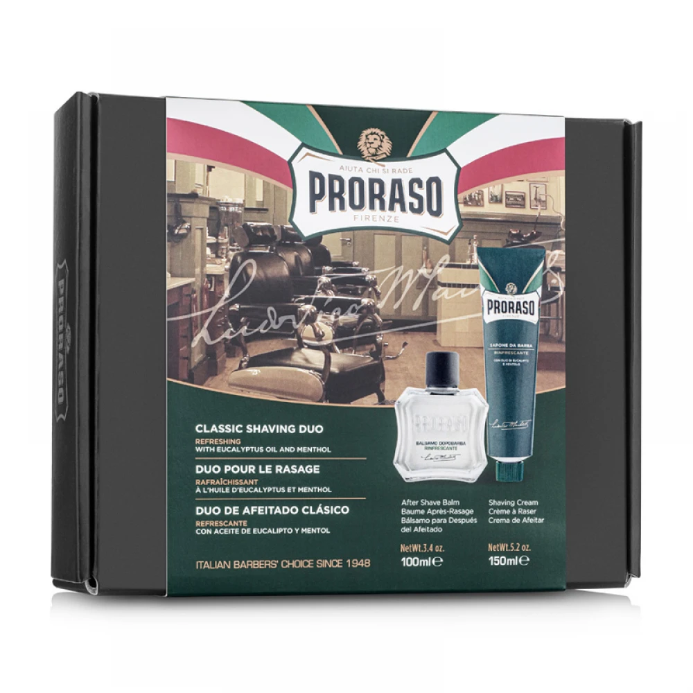 Proraso Duo Pack Tube + Balm Refreshing — це високоякісний набір натуральної косметики для традиційного вологого гоління з зеленої лінійки культового італійського бренду.