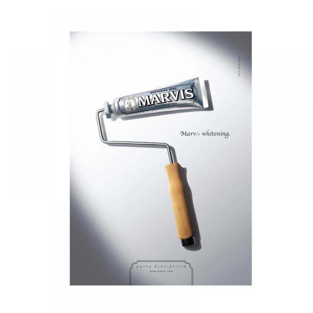 Разом з цим, дизайн плаката прекрасно передає філософію Marvis і призначення продукції бренду: в кінці валика, в кращих традиціях сюрреалізму, знаходиться тюбик із зубною пастою від італійців, який немов "очищає" поверхню, що демонструє плавний перехід від темно-сірих тонів внизу плаката до яскравого і білосніжного кольору зверху. При цьому, напис біля валика — Marvis Whitening — ідеально розкриває специфіку та основну місію зубних паст компанії — відбілювання, що власне й демонструється на плакаті.