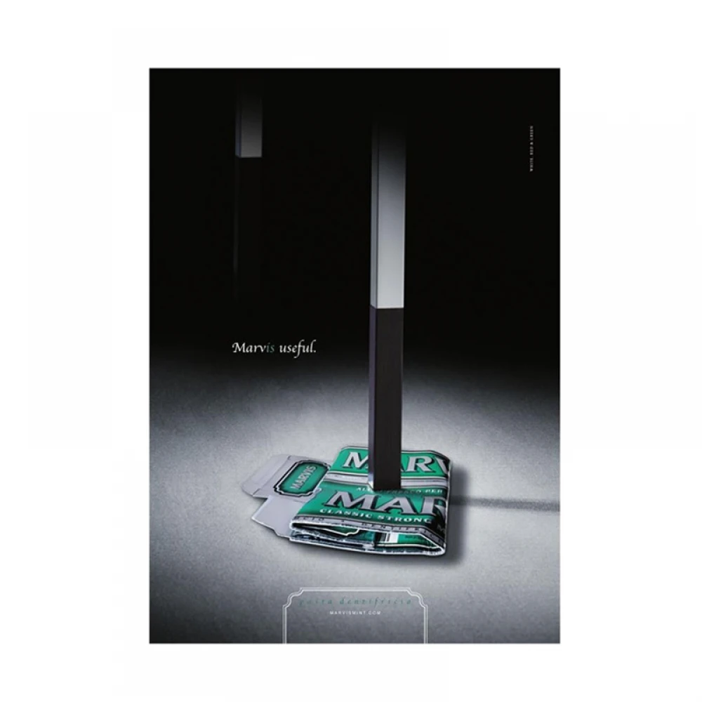 Крім цього, на плакаті також присутній креативний напис "MarvIs useful" що з англійської можна перекласти як "Marvis — це корисно", і найкраще це демонструє висока якість, а також широка популярність зубних паст від італійців.