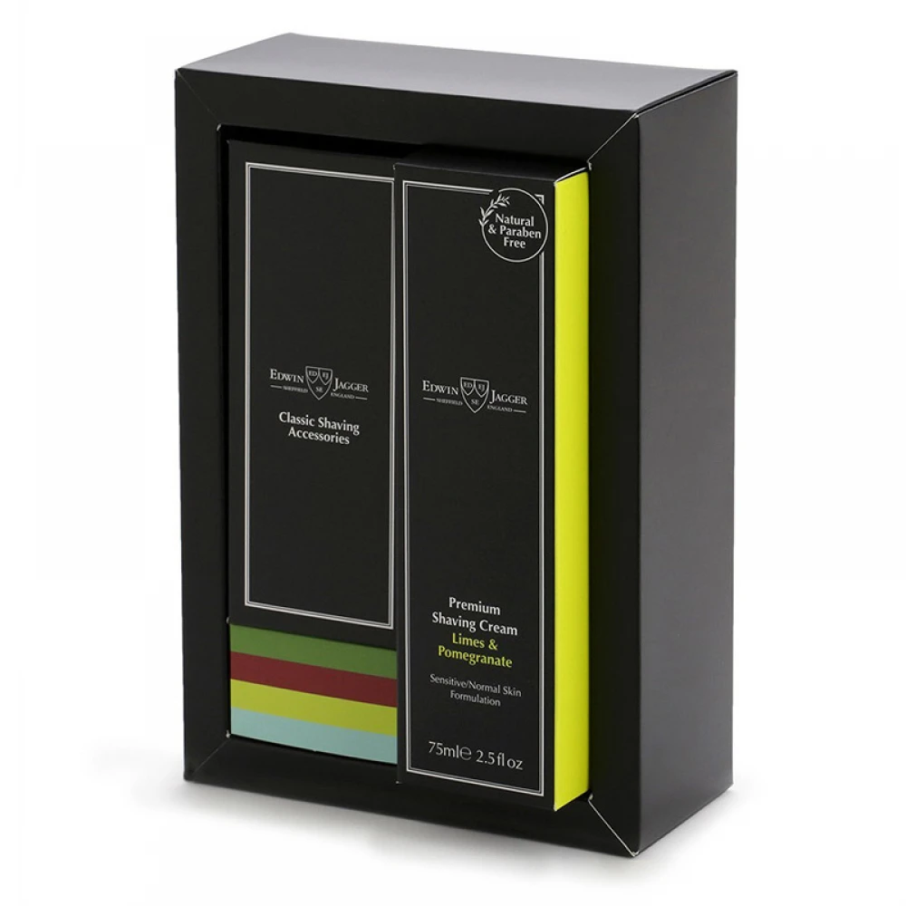 У набір входить помазок з нової колекції EJ і крем для гоління з ароматом лайму та гранату.