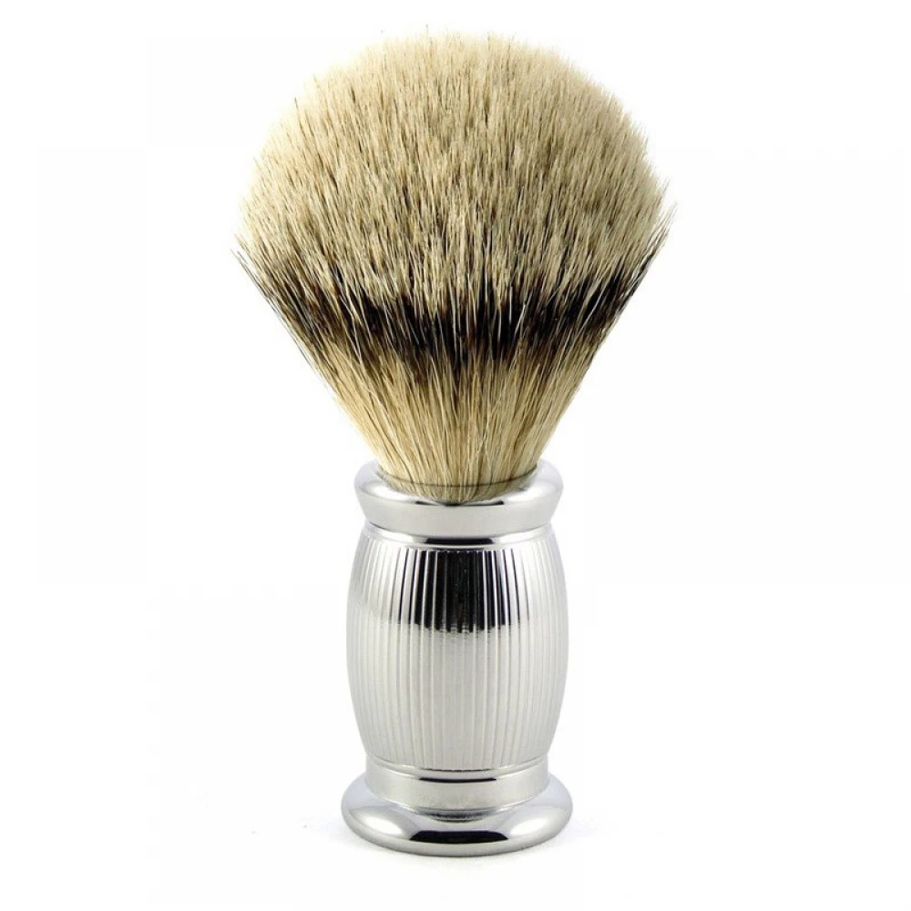 Помазок з колекції Bulbous Lined. Наповнений справжнім ворсом борсука категорії super badger. Хромована латунна ручка з рельєфним малюнком. Підходить для будь-якого типу шкіри.