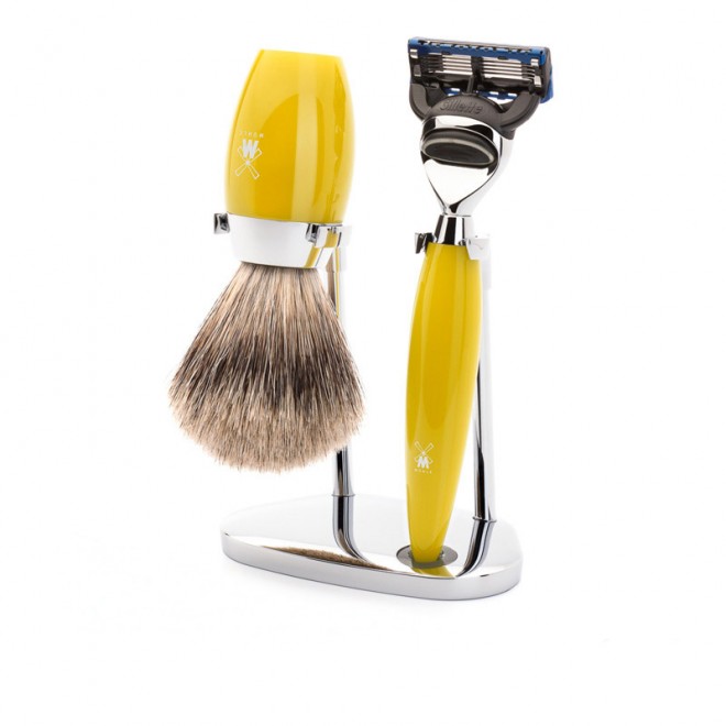 Набор для бритья Muhle S 281 K 874 F Kosmo включает три предмета: помазок из барсучьего ворса типа Silvertip, станок для бритья бритвенной системы Gillette Fusion, и хромированную подставку. Каждый из трех элементов набора изготовлен из материалов премиум-класса. В частности, ручки помазка и станка для бритья изготовлены вручную из высококачественной синтетической смолы. Оба изделия имеют лимонно-желтый цвет.