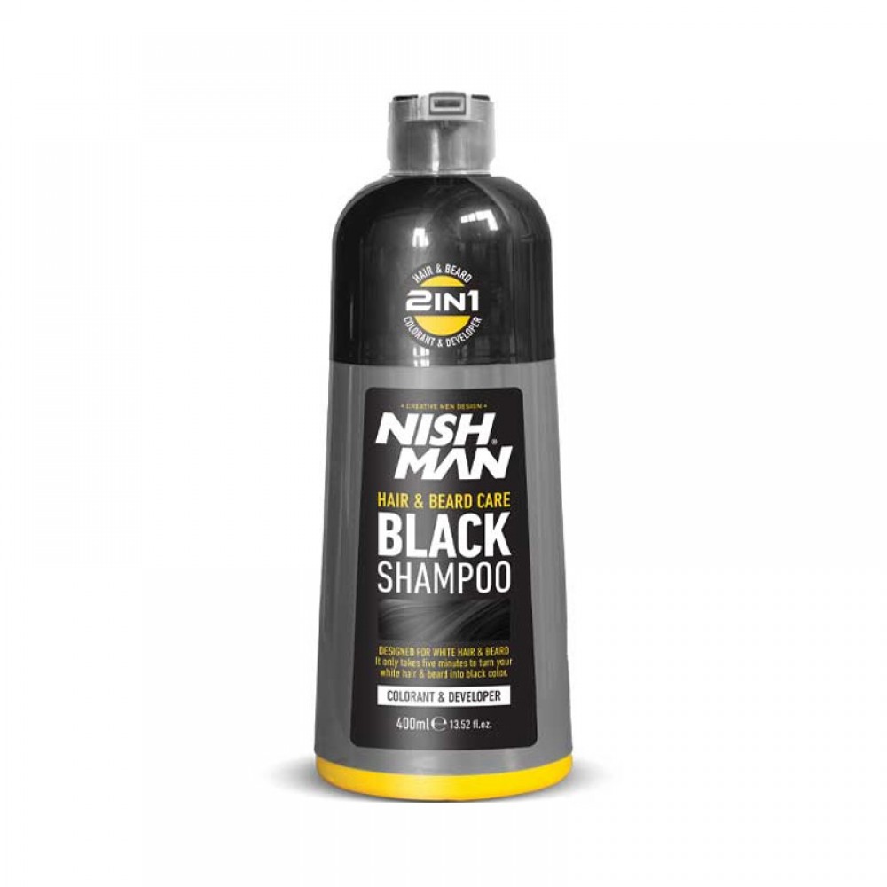 Шампунь-краска для волос и бороды Nishman Hair & Beard Black Shampoo маскирует седые волосы. В этом шампуне совмещены краска и проявитель (два в одном). Поможет окрасить волосы в черный цвет всего за 5 минут. Благодаря специальной формуле волосы становятся черными. А также шампунь Nishman Hair & Beard Black Shampoo питает, защищает и восстанавливает цвет волос. Продукт подходит для всех типов волос.