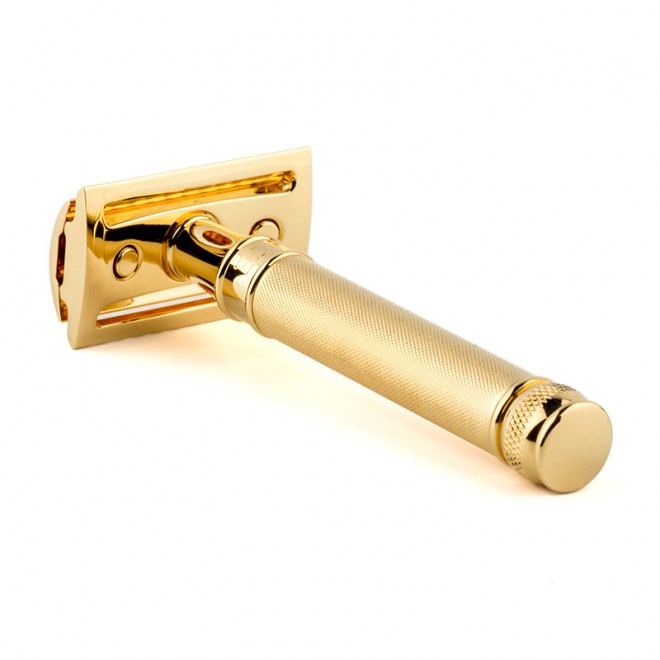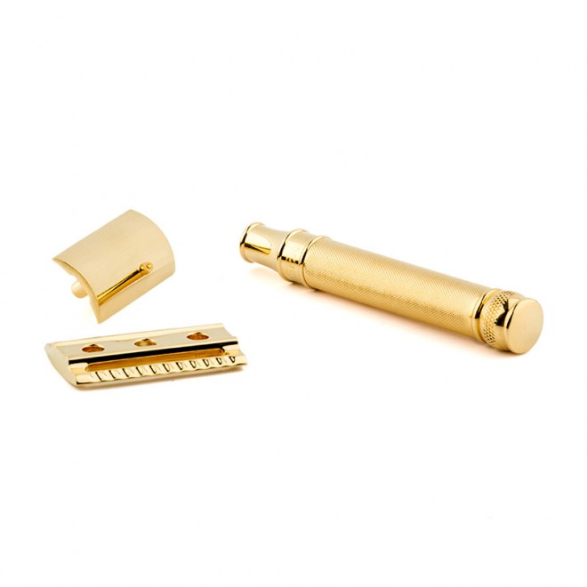Изысканная бритва на лезвия в золотом цвете. Станок сделан полностью из 23-каратного золота.
