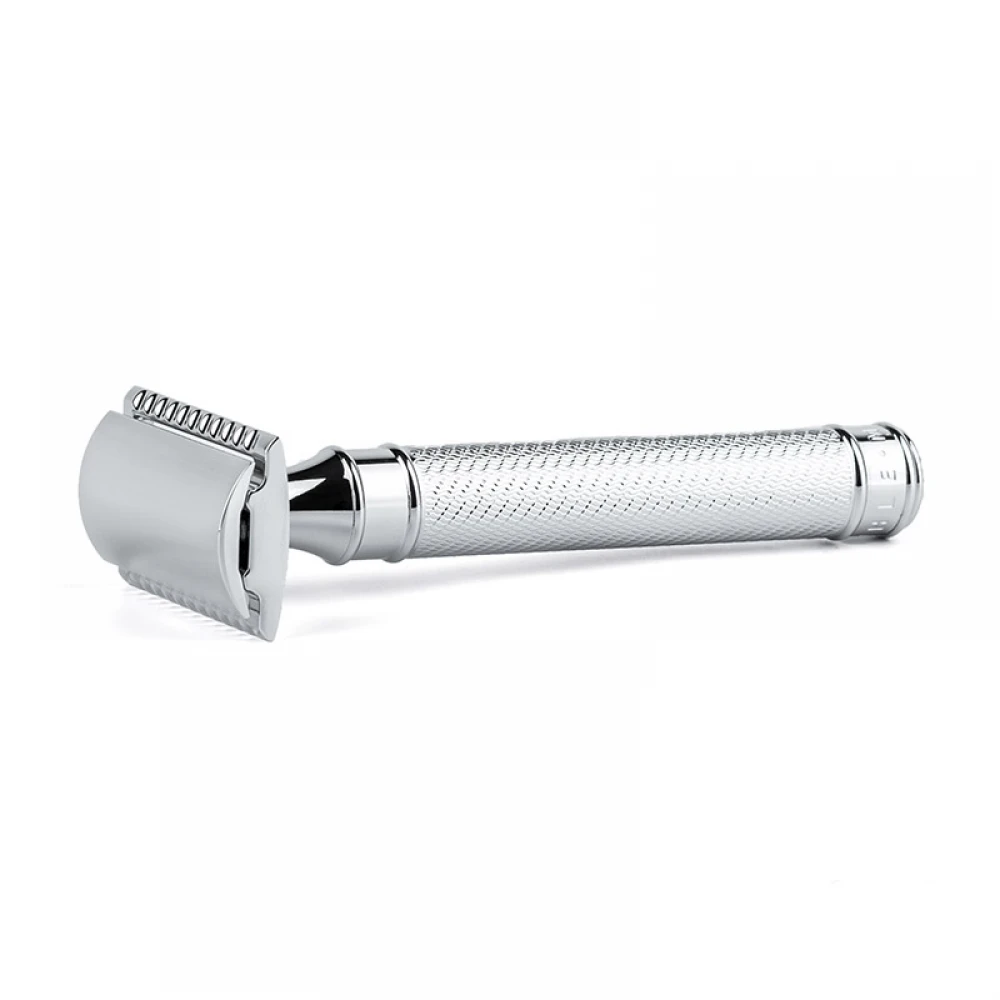 Станок полностью изготовлен из хромированного металла и состоит из трех частей. Лезвия Mühle R89 Grande можно легко заменить, открутив крышку головки. Ручка бритвы имеет специальную структуру, благодаря которой она не будет выскальзывать из руки во время использования. Также, R89 Grande оборудован неподвижной головкой закрытого типа, поэтому вероятность порезов или появления раздражения минимальна.