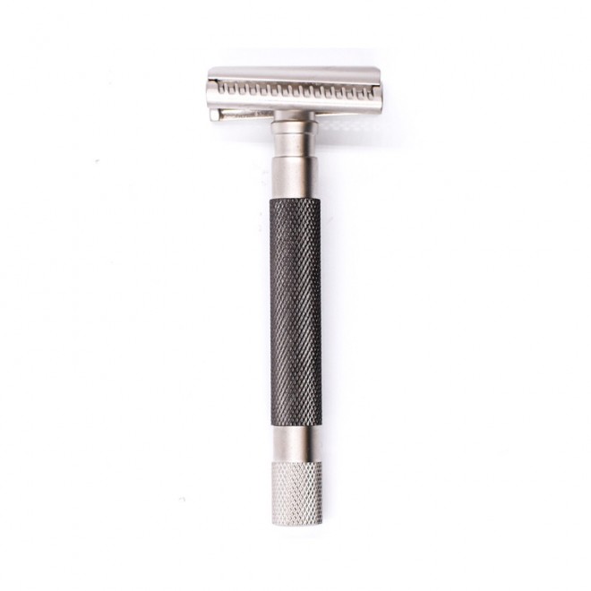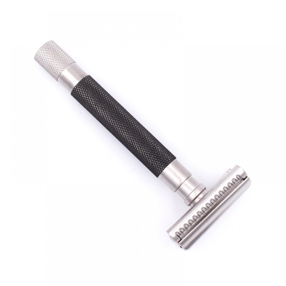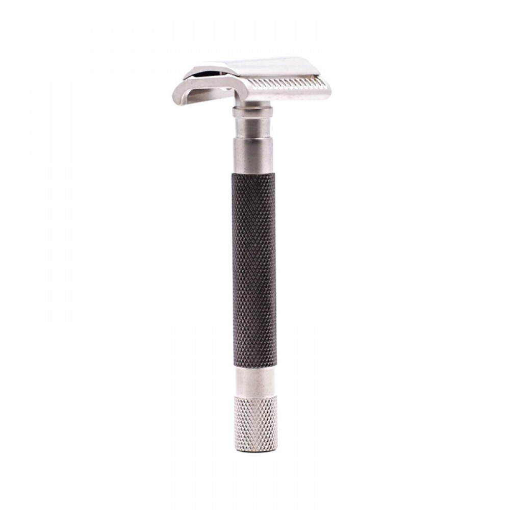 Рукоять бритвы изготовлена из твердой латуни с фактурным покрытием из гальванического графита и сатинированного хрома. Это обеспечивает лучшее сцепление, благодаря которому бритва не выскользнет даже из мокрых рук.