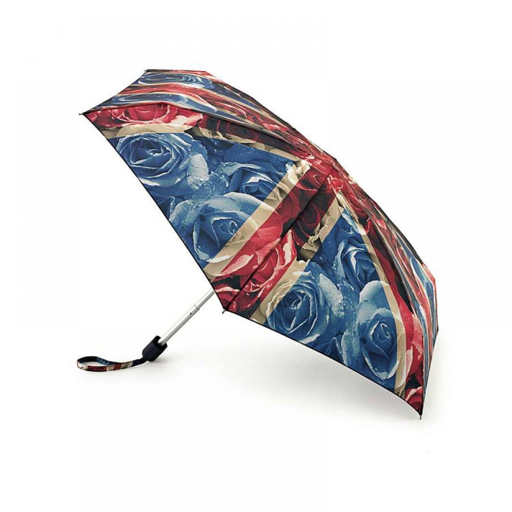 Женский складной зонт FULTON TINY-2 ROSE JACK L501 (7S2431) с английским флагом и большими розами на куполе. Конструкция из алюминия и фибергласса ветроустойчивая и прочная.