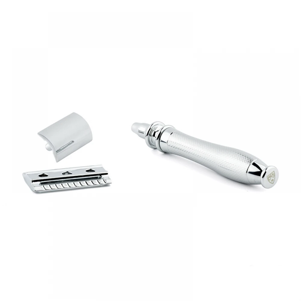 Станок для гоління Т-подібний із серії Chatsworth Metal Barley з закритим гребенем. Підходить для новачків. Корпус з латуні з потрійним покриттям міддю, хромом, нікелем. Рельєфний малюнок на ручці.