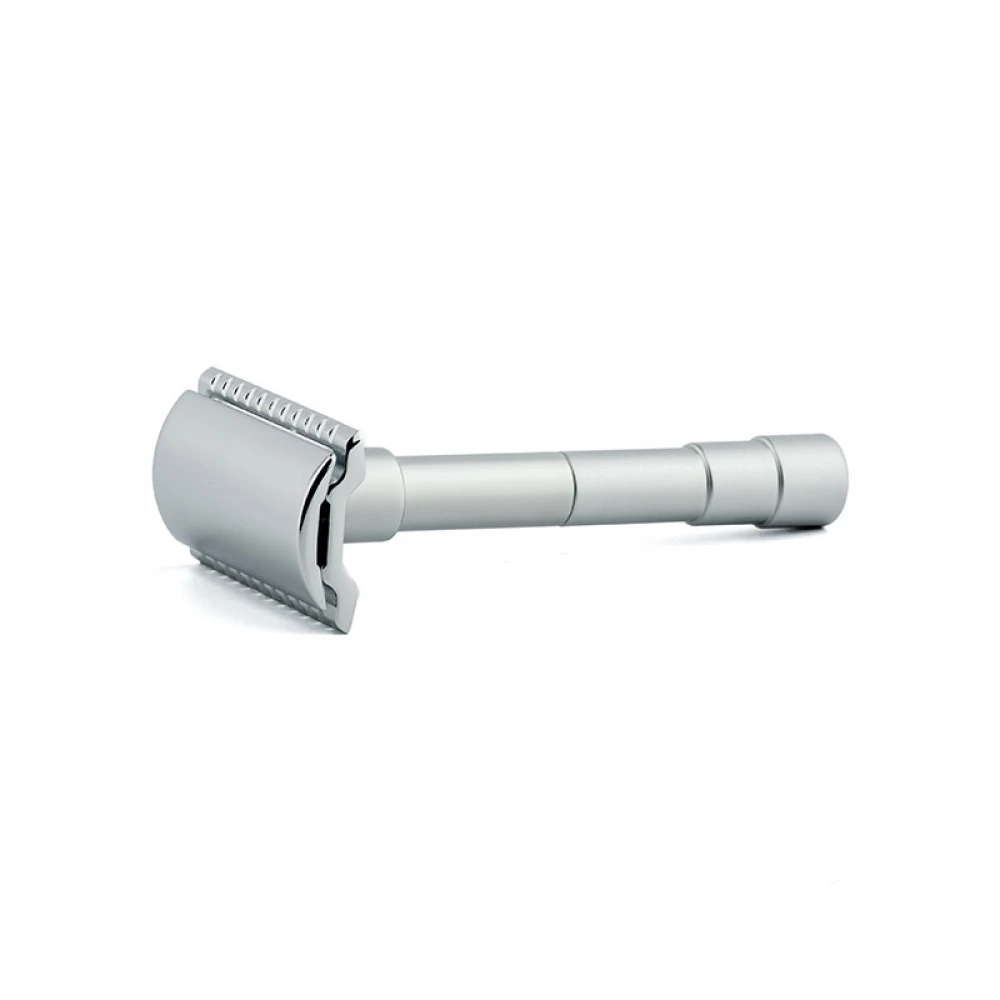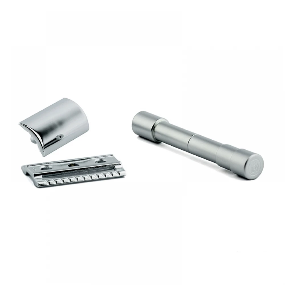 Т-подібний Станок для Гоління Merkur Solingen Travel Razor ідеально підходить для того, щоб забезпечити собі безпечне і комфортне гоління в будь-якій поїздці. Шкіряний чохол дозволить зручно перевозити і зберігати бритву. Ручка розбирається на 2 частини, а голова станку легко знімається. Це дозволяє зберігати кожну деталь бритви в індивідуальному захисному корпусі. Матове покриття ручки сприяє надійній фіксації станку в руці, а полірована головка допомагає легко ковзати бритві по поверхні особи.