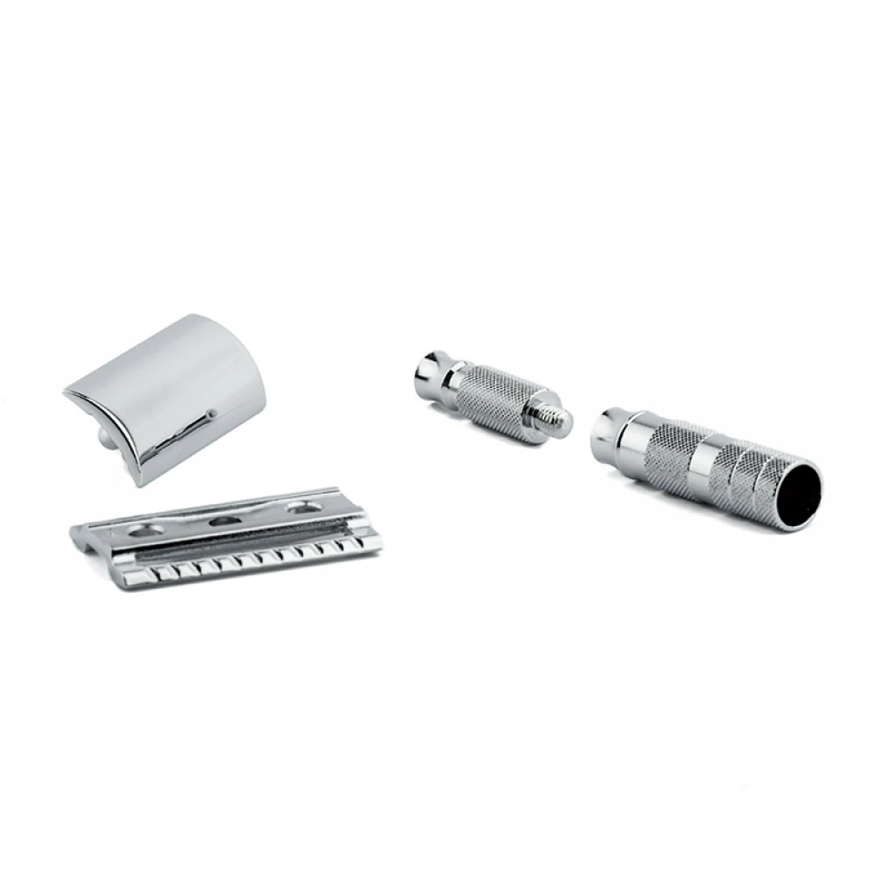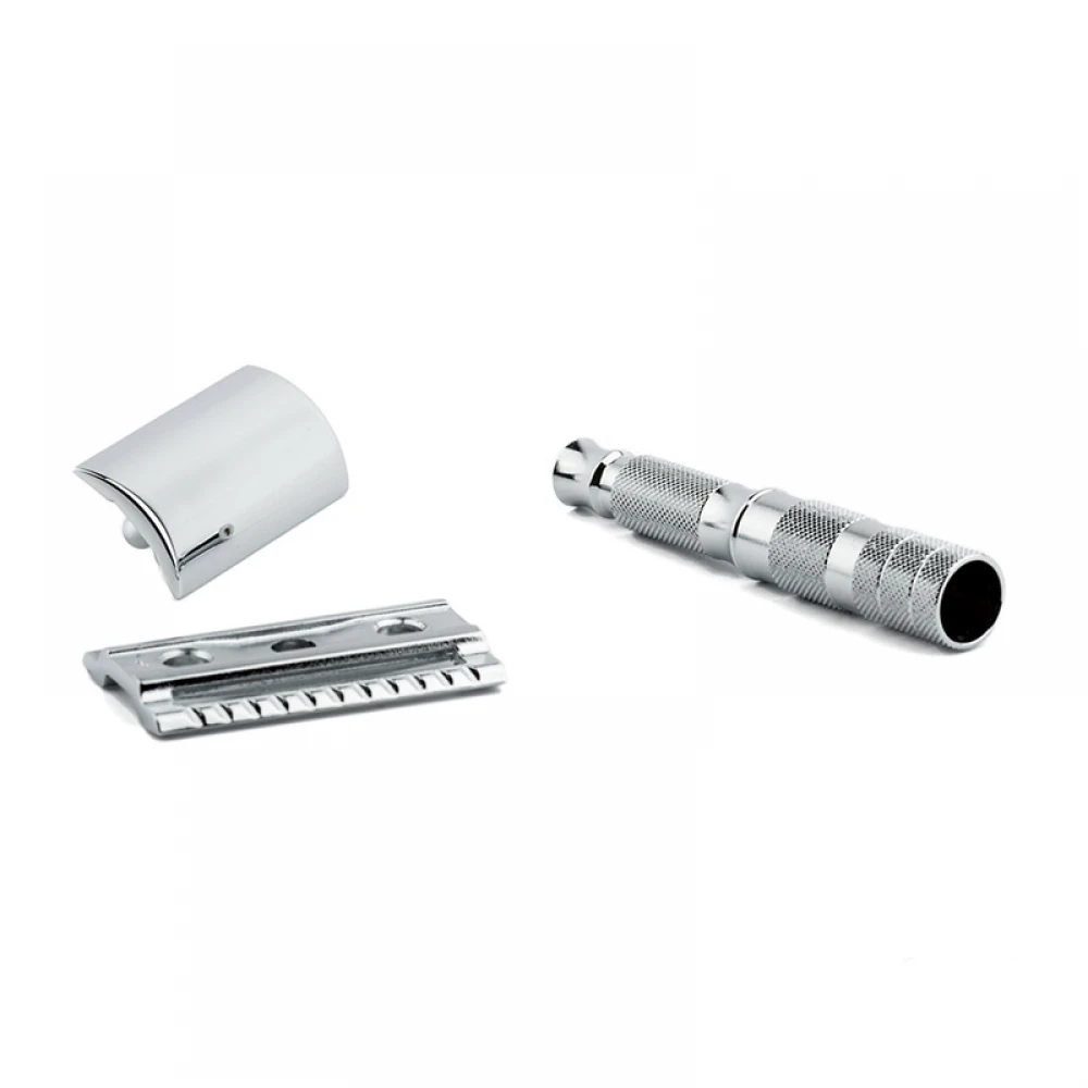 Т-подібний станок для гоління Merkur Solingen Travel Razor з полірованою хромованою обробкою. Станок розбирається на 3 частини.
