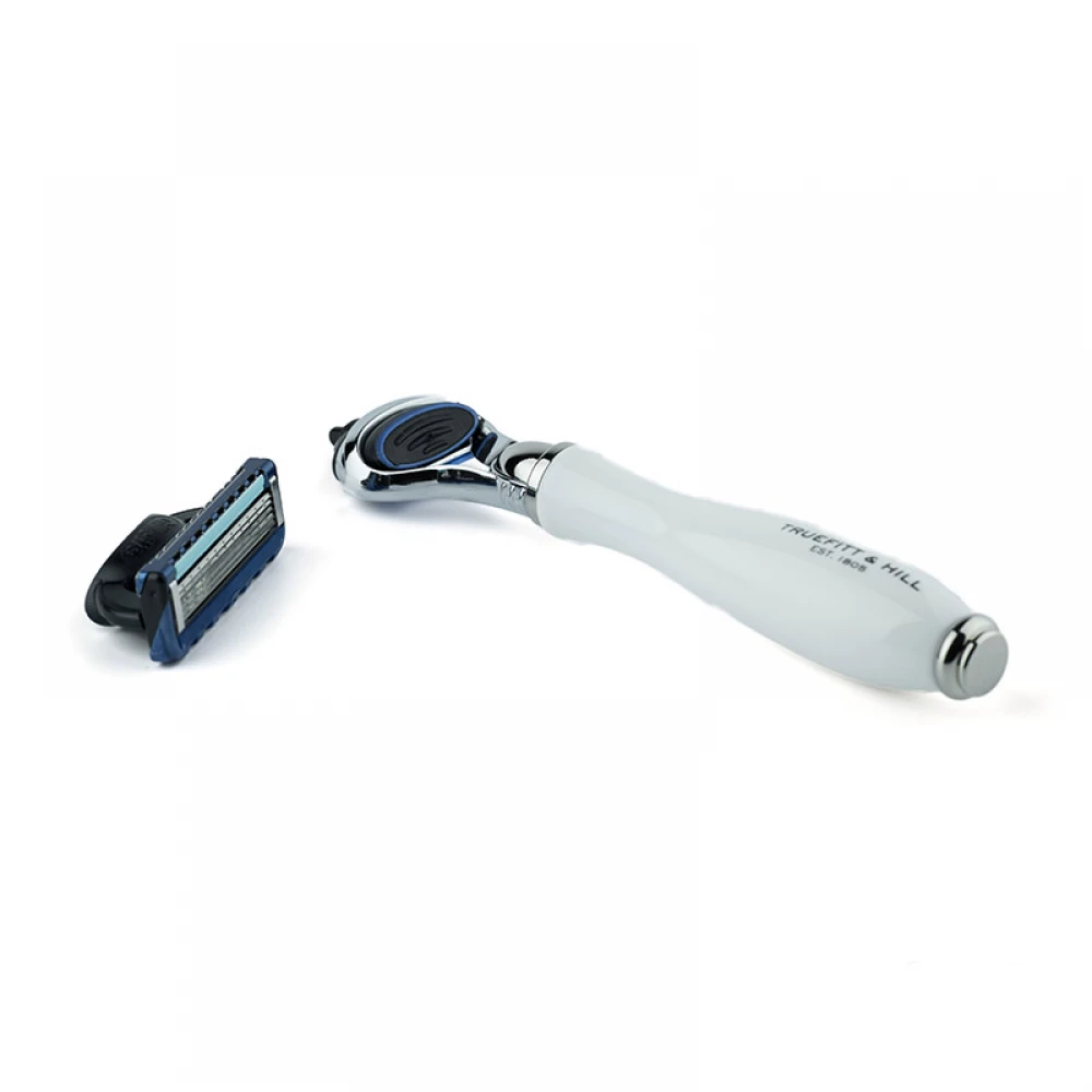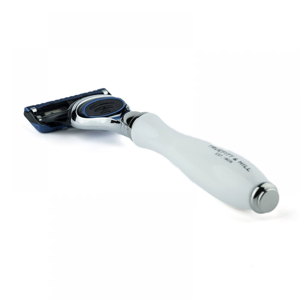 Станок для гоління TRUEFITT & HILL WELLINGTON FAUX PORCELAIN FUSION білого кольору. З системою для гоління Fusion, зручна ручка, класичний дизайн.