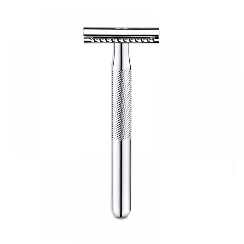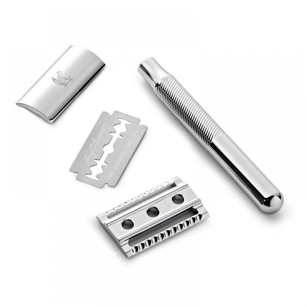 Металева ручка з хромованим покриттям виглядає стримано й стильно, добре лежить у руці та додає відчуття якості. Вага станка збалансована — він не легкий, як пластикові бритви, але саме це допомагає голитися без зайвого натискання.