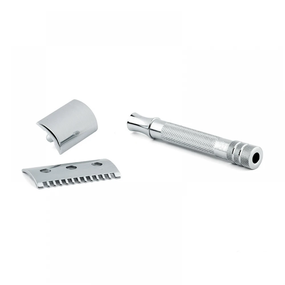 Корпус бритви складається з трьох змінних частин: руків’я і двох пластин голівки. Станок виготовлено з міцного металевого сплаву, завдяки чому він безвідмовно слугуватиме Вам роками, якщо не десятиліттями! Довжин бритви – 82 мм, а вага – 67 г.