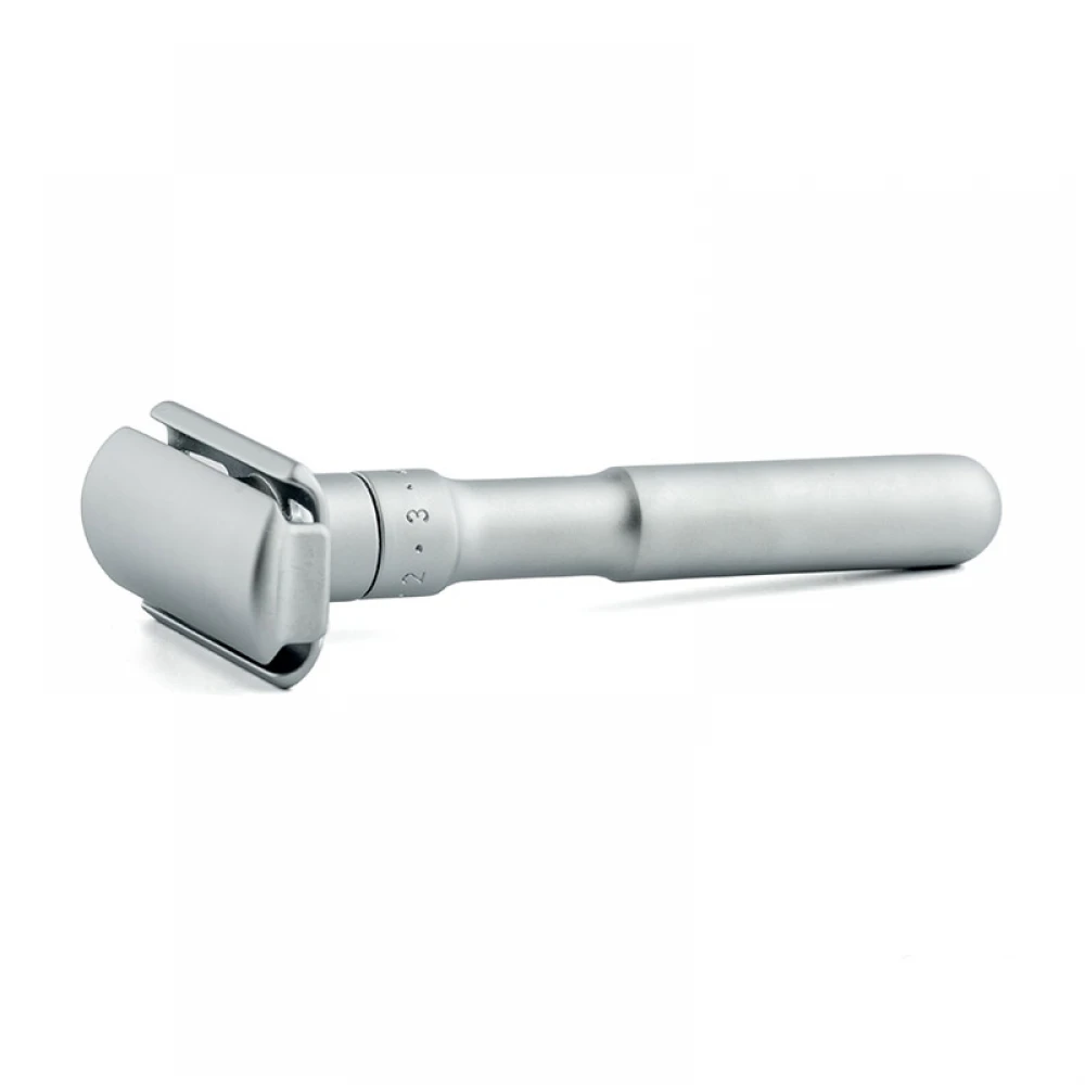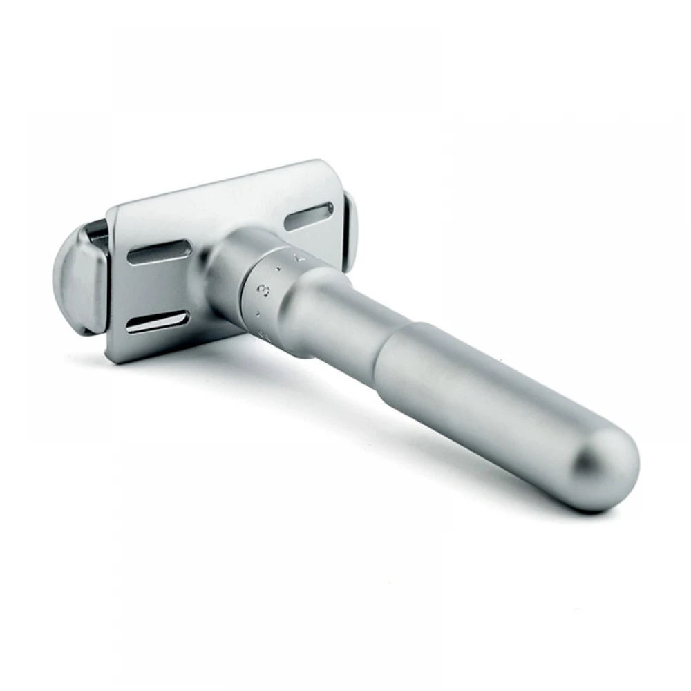 Простий і надійний матовий Т-подібний станок для гоління Merkur Futur з гребенем типу Adjustable – це чудова бритва як для новачків, так і для досвідчених користувачів безпечною класикою. Особливість цього станка полягає у можливості регулювання зазору між гребенем і лезом, що безпосередньо впливає на агресивність бритви.