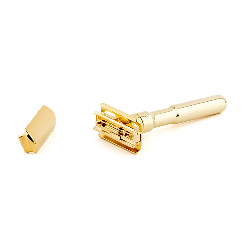 Стильна позолочена Т-бритва Merkur Futur – це синонім якісного і комфортного гоління. Станок ідеально підійде як новачкам, так і досвідченим фанатам безпечної класики завдяки голівці типу Adjustable, яка дає змогу самостійно визначати зазор між лезом і гребенем, змінюючи агресивність бритви. Водночас її фантастичний зовнішній вигляд підкреслює статус справжнього чоловіка. Обережно! Мигцем побачивши у Вас таку бритву, знайомі почнуть кидатися заздрісними поглядами.