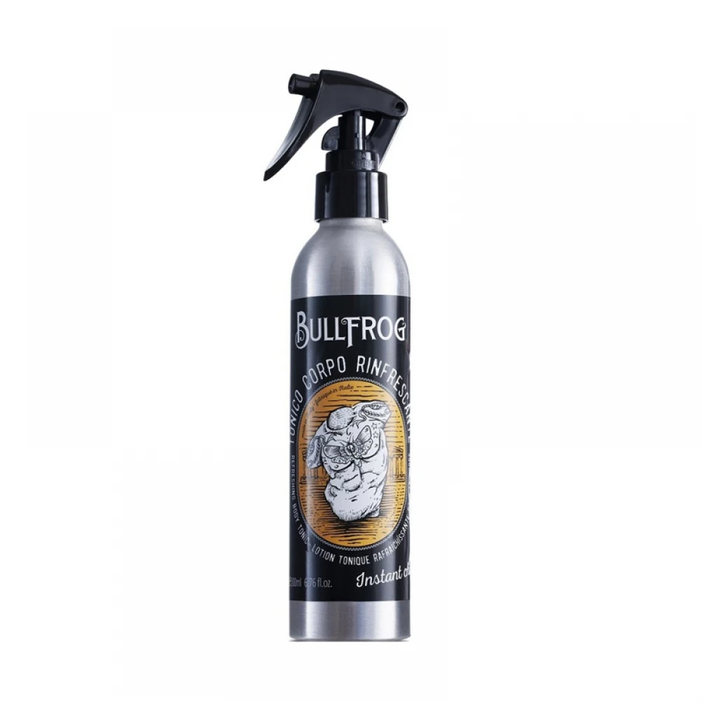 Освіжаючий тонік для тіла Bullfrog Refreshing Body Tonic — це ідея задовольнити потребу в оновленні, переосмисливши класичний дезодорант. Однак це не звичайна ароматизована вода для тіла, а справжній освіжаючий і заряджаючий енергією комплекс, ідеальний для відновлення комфорту, життєвих сил і зволоженої та свіжої шкіри. Виготовлено відомою міланською перукарнею Bullfrog. Для приємного зволоження та освіження втомленої шкіри, до якої він додасть необхідні поживні речовини. Тонік має аромат, який викликає відчуття благополуччя, зберігаючи сильну ідентичність. Він має пряні та свіжі ноти, де найінтенсивніші смаки ветівера пом’якшуються блискучими та свіжими нотами цитрусових, таких як грейпфрут. Зелена нота ревеню - це середовище, в якому розвивається аромат.